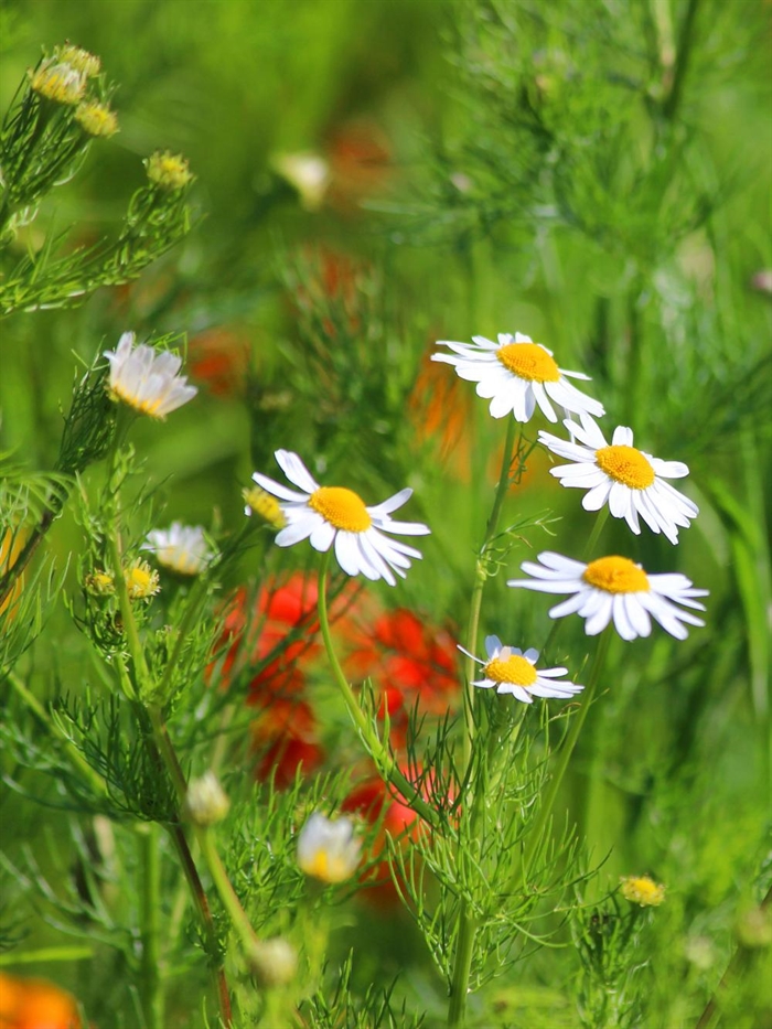 Flerårige: Alm. røllike, Achillea millefolium; Cikorie, Cichorei Selvatico da Campo; Hvid okseøje ("Marguerit"), Chrysanthemum Leucanthemum; Hvid snerre, Galium mollugo; Alm. kællingetand, Lotus corniculatus; Hulkravet kodriver, Primula veris; Dagpragtstjerne, Silene dioica; Blæresmelde, Silene vulgaris; Foderesparsette, Onobrychis viciifolia; Blåhat, Knautia arvensis